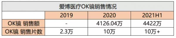 值得注意的是,另一家国产公司——爱博医疗进展神速,让欧普康视备感压力。2019年3月,爱博医疗获得OK镜的批文,当年销售片数为2.3万片。到2020年,销售额高达4126万元,销售片数高达10万片,后者同比大增339.7%。2021年,放量更为迅猛,上半年销售额高达4422万元,销售片数已经高达10万+,全年目标为20万片。