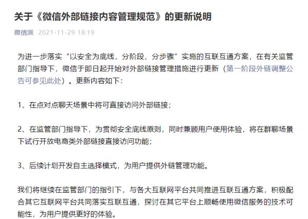 11月29日晚,微信发布公告称,即日起调整外部链接管理措施。用户在点对点聊天场景(也就是私聊窗口)中将可直接访问外链;同时将在群聊场景下,试行开放电商类外部链接直接访问功能。