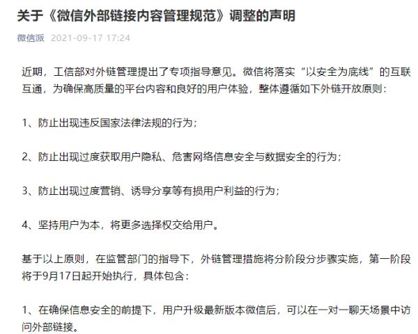9月17日当天,微信发布“关于《微信外部链接内容管理规范》调整的声明”,宣布将分阶段、分步骤实施新的外链管理措施。