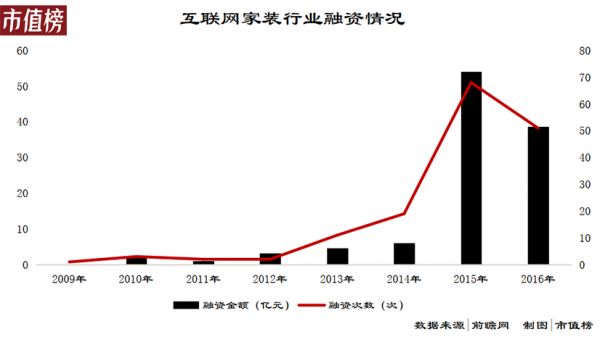 在尽可能地减少信息不对称这一契合点下,家装行业获得了资本的青睐。2015年,互联网+成为大热词汇,这一年也成为了互联网家装的元年,前瞻经济学人数据统计,仅这一年,就有68起融资。