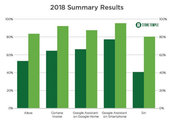 Stone Temple在2018年曾做过专题研究,用5000多种不同的查询问题对市面上的虚拟助理能力进行比较。最终Google Assistant胜出,其能回答超过90%的问题,并保证准确率高达80%。而Siri仅能回答其中80%的问题,准确率在40%左右。