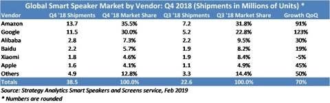 智能音箱是虚拟助理的重要落地产品,也是业内公认的未来智能家居第一入口。Strategy Analytics发布的报告显示,2018年第四季度,亚马逊Echo以1370万台的出货量位列行业第一,谷歌Home音箱排在第二位,出货量为1150万台。