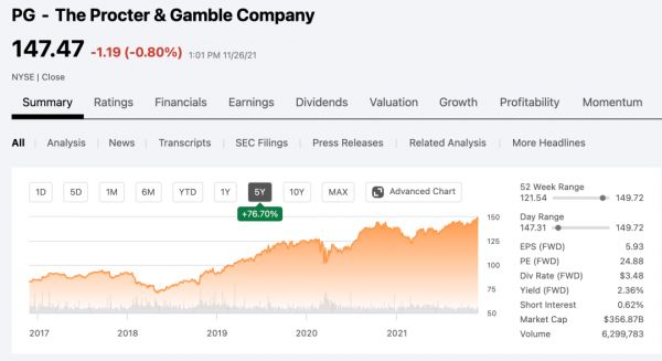 雅诗兰黛和宝洁近5年的股价走势 图源:Seeking Alpha