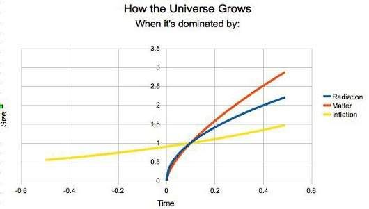 但如果我们回头看看我们的“开始”概念,真的很有趣。然而,一个有物质和/或辐射的宇宙——我们从热大爆炸中得到的——总是可以推断出奇点,而暴涨理论下的宇宙则不能。由于它的指数性质,即使你把时钟倒转无限长的时间,空间也只会接近无穷小的大小、无限的温度和密度;它永远也到不了那里。这意味着,除了不可避免地导致奇点之外,暴涨本身绝对不能让你达到奇点。“宇宙起源于一个奇点,这就是宇宙大爆炸”的观点,在我们认识到一个膨胀阶段先于我们今天所处的那个炎热、稠密、充满物质和辐射的阶段时,就需要抛弃了。