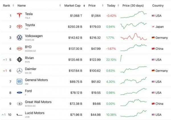 反观美股市值排名前十的企业如苹果、微软、谷歌、亚马逊等科技企业,它们都具备高增长空间、高利润的特点。而这个逻辑放在车企的市值排名中,仿佛不那么受用。目前还没有任何盈利的Rivian与Lucid Motors市值跻身全球车企前十,把福特与宝马等百年车企甩在身后。