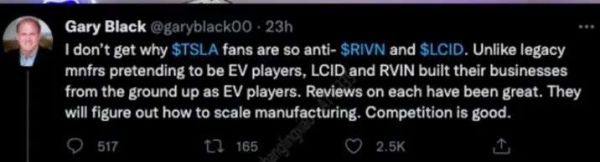 “特斯拉的拥趸没必要那么排斥Rivian、Lucid Motors这样的初创企业,有竞争总是好事。”高盛前投资主管 Gary Black在推特上发文说道。当然,Competition(竞争)确实是好事,可overvalue(过高估值)是另一回事,尤其是资本市场已经有特斯拉这样一个标杆企业在前。