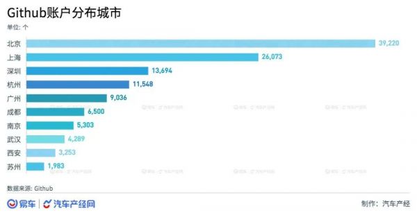 比如在技术人才储备方面,官方并没有给出明确的统计数据,但从程序员常用的Github网站统计的程序员所处城市分布可以发现,北京遥遥领先于国内其他城市,在全球也进入前三。