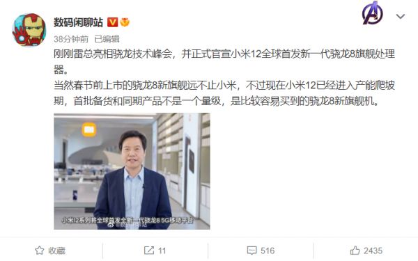 据微博博主 @数码闲聊站 称,春节前上市的骁龙 8 新旗舰远不止小米,不过现在小米 12 系列已经进入产能爬坡期,首批备货和同期产品不是一个量级,是比较容易买到的骁龙 8 新旗舰机。