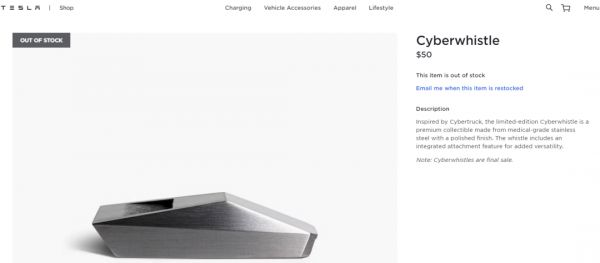 12月1日,特斯拉官网信息显示,特斯拉推出限量版Cybertruck造型哨子,售价每只50美元(约318元人民币)。
