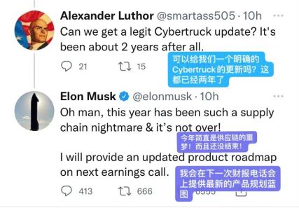 11月30日,特斯拉首席执行官埃隆·马斯克(Elon Musk)发推回复网友称,“今年简直是供应链的噩梦,而且还没结束,”指出电动皮卡Cybertruck的生产面临着挑战。此外,马斯克称他将会在下一次财报电话会议上提供最新的产品规划蓝图(roadmap)。