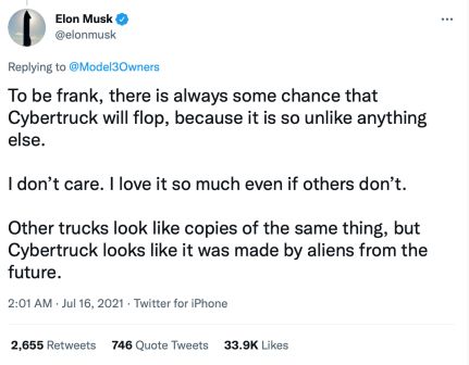 马斯克本人对这款车十分满意,并曾不止一次在媒体公开采访和推特上称赞这辆车。今年7月,马斯克就曾在推特上表示,Cybertruck一直都有些许失败的可能,因为它如此与众不同。他强调,别的卡车看起来像是复制同个模型,而Cybertruck如同来自未来的外星人所做,他还表示“即使其他人不爱,我还是非常喜欢。”