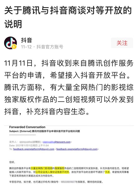 11月12日,抖音在官方账号上公开的一份商务邮件引发全网关注。邮件内容显示,腾讯创作者服务平台正式申请接入抖音开放平台,希望通过腾讯生态下的影视内容资源,补充抖音内容生态。