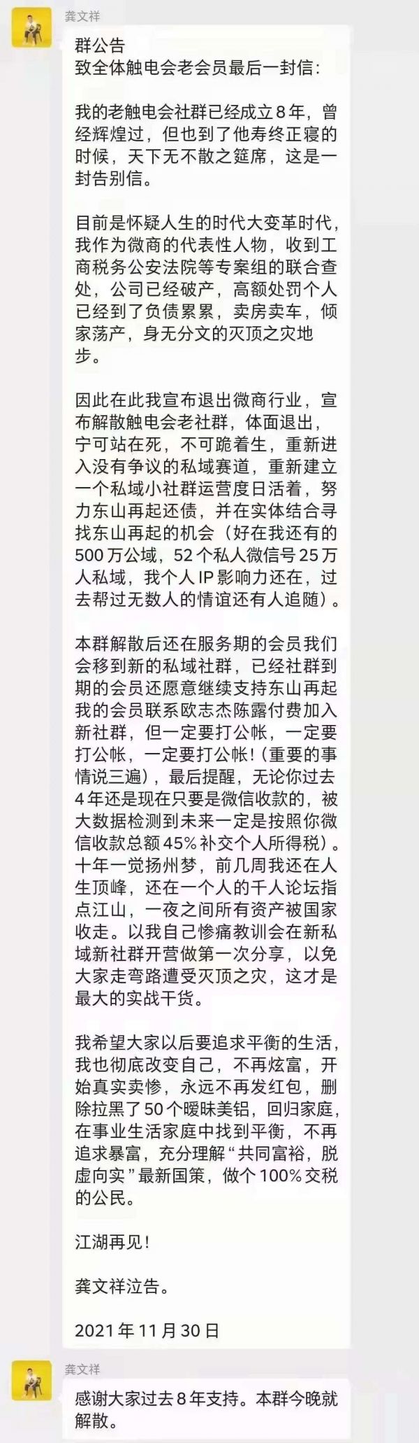 直到11月30日晚,龚文祥自爆:“收到了工商税务公安法院等专案组的联合查处,公司已经破产,高额处罚个人已经到了负债累累,卖房卖车,倾家荡产,身无分文的灭顶之灾地步。”并表示将解散触电会原有社群,退出微商行业。
