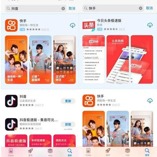 这个面向开发者的搜索广告业务,就是售卖App Store搜索结果中的广告位。当用户在App Store中搜索“抖音”时,排在搜索结果最上面的可能会是由快手购买的广告位;当用户搜索“快手”时,排在最上面的可能就会变成今日头条极速版购买的广告位。
