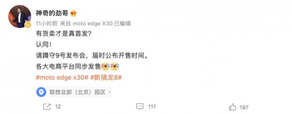 新骁龙8移动平台发布后,许多国产手机品牌都在宣传自己的发布计划,有争首发的、有宣布首批搭载的,也有表示要在明年第一季度发布的。其中争得最激烈的是小米和联想,当小米官宣要首发新一代骁龙8移动平台时,却突然被联想截胡,联想高管表示要在本月9号召开新品发布会,为了回怼联想并证实自己是“真首发”,此后小米官博发布新一代骁龙8芯片与小米12的工厂装配视频。看来,在首发这件事上双方算是杠上了,都在向市场释放自己要首发的信号。