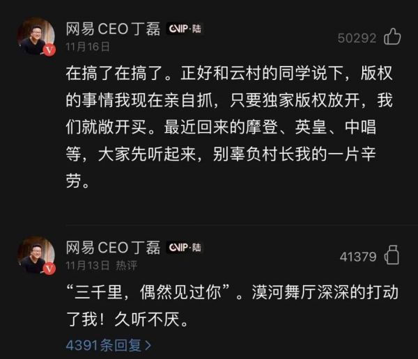 「在搞了在搞了。正好和云村的同学说下,版权的事情我现在亲自抓,只要独家版权放开,我们就敞开买。最近回来的摩登、英皇、中唱等,大家先听起来,别辜负村长我的一片辛劳。」评论《漠河舞厅》之后,丁磊还回复了「村民」对于版权的关心。