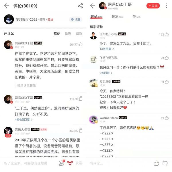 在丁磊的网易云音乐个人账号中,每一条动态下都挤满了“版权”二字,其中周杰伦歌曲版权的呼声尤其高。