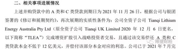 要知道,天下没有免费的午餐,天齐锂业18.84亿美元并购贷款再次展期的实质性条件为:“公司全资子公司Tianqi Lithium Energy Australia Pty Ltd(原全资子公司Tianqi UK Limited2020年12月6日更名,以下简称“TLEA”)完成增资扩股引入战略投资者交易,且通过该交易偿还A类和C类贷款本金不低于12亿美元,并偿付该部分本金对应的利息”。
