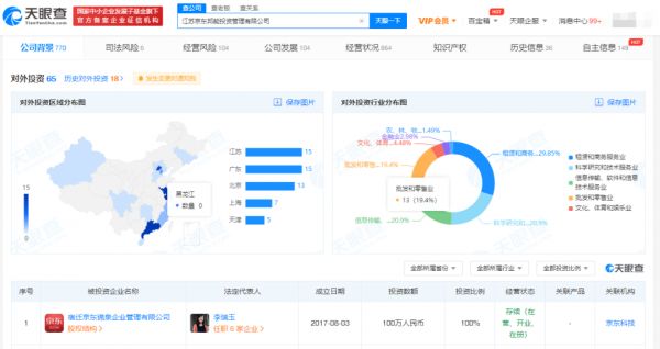 值得一提的是,在刘强东和章泽天两人共同控股的公司中,还包括一家2015年成立的名为宿迁天强股权投资合伙企业(有限合伙)的投资平台。有统计显示,该平台共投资超110家企业,投资领域遍布互联网、餐饮、医疗、生物科技等领域。