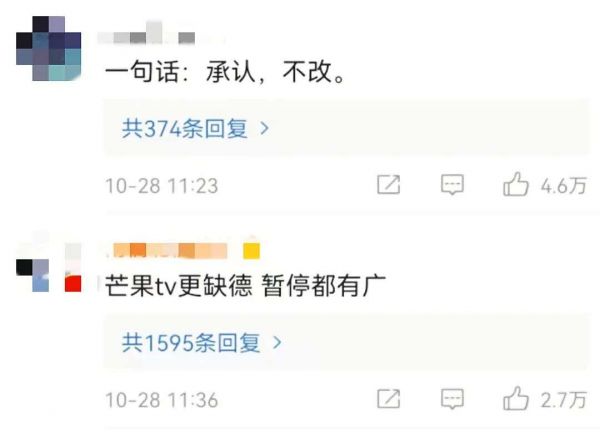 比如10月底微博上#爱奇艺腾讯视频回应会员也得看广告#的话题,阅读量高达2.3亿,中国新闻网官微下“一句话:承认,不改”的评论获赞4.6万,吐槽芒果TV暂停时广告的评论吸引了2.7万赞、1600条回复;还有“钱太好赚了,服务再怎么差还是有人送钱”、“大家一起抵制的话,看平台敢这么说”等反应。