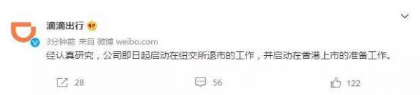 12月3日,滴滴出行通过官方微博表示,经认真研究,公司即日起启动在纽交所退市的工作,并启动在香港上市的准备工作。