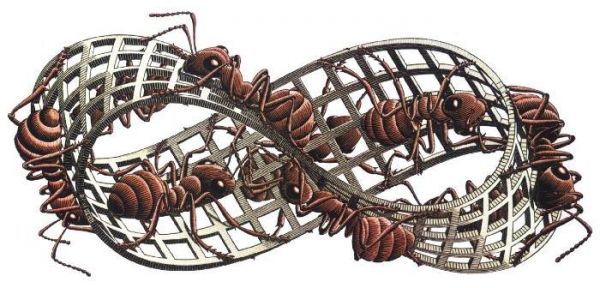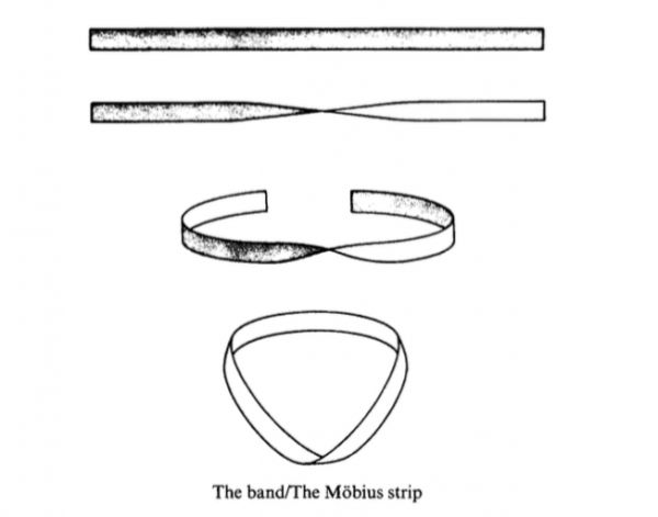 拉康直截了当地指出,欲望的原因本质上是莫比乌斯带,或者至少,和莫比乌斯带具有相同的结构。就像欲望的主观性一样,莫比乌斯带本身也有一个内在的分裂点。如果作为一个整体,一个三维的单一实体,那么莫比乌斯带只有一面。然而,如果莫比乌斯带被从一处切开,那么它实际上有两个面。主体和客体是相关的,但主体和客体永远不能“相遇”,它们在同一个地方,但在莫比乌斯带的两边。