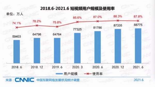 2018年的时候,短视频赛道上占据的用户与长视频赛道还算旗鼓相当。但根据中国互联网络信息中心发布的《中国互联网络发展状况》统计报告显示,截至2021年6月,我国网络视频用户规模达9.44亿,其中短视频用户规模为8.88亿,较2020年12月增长1440万,占网民整体的87.8%。