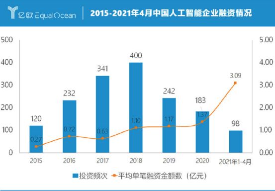 商汤科技成立于2014年,次年便迎来了中国AI行业持续4年的融资热潮。据亿欧数据显示,到2018年,AI领域当年的投资次数已高达400起,平均每天都有1.1次投融资事件发生。