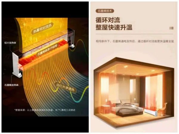 石墨烯是一种二维碳纳米材料,这种新材料具有较好的热传导性能,纯的无缺陷单层石墨烯是迄今为止导热系数最高的碳材料。石墨烯在发热时会释放6-16微米的远红外线辐射热量,该波段的远红外线接近人体波长,易渗透皮肤,被人体吸收。因此石墨烯在踢脚线取暖器、暖风机等产品中被作为升级的辅助发热元件材料使用,采用该材料的产品多强调速热功能。