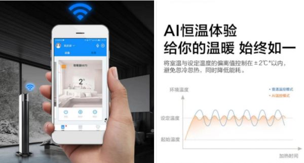 比如米家取暖电器内置智能控温系统,可根据设定的目标温度可自动调节功率,达到低碳省电的效果;美的智能暖风机同样内置自动控温系统,还具备AI恒温控制,据称可以控制室温与设定温度的偏离值在±2℃以内。