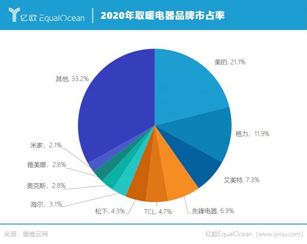 最新数据显示,2020年美的与格力分别以21.1%和11.9%的市占率位居取暖电器赛道的第一梯队;先锋、艾美特位于第二梯队,市场份额约保持7%;下一梯队则是TCL、松下、海尔、米家等品牌;此外,还有诸多小品牌占据剩余33.2%的市场份额。