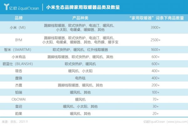 小米公司得益于智能家居生态链布局,已有实力在取暖电器赛道占据一席。据京东搜索,小米旗下的家用取暖电器商品数超过5万,已超过目前市占率第一的美的。除表格统计的品牌外,小家取暖生活电器生态品牌还包括布谷鸟、瑚桔、美昀(meiyun)等。