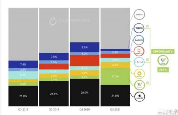 从公开数据来看,软硬件两方面大幅革新的Wear OS几乎迅速就取得了巨大成功。搭载Wear OS 3的三星Galaxy Watch 4系列智能手表仅仅上市不到一个季度,就帮助Wear OS生态的市占率从3.2上涨到了17.3%,一跃从“吊车尾”变成了仅次于苹果的第二大势力。