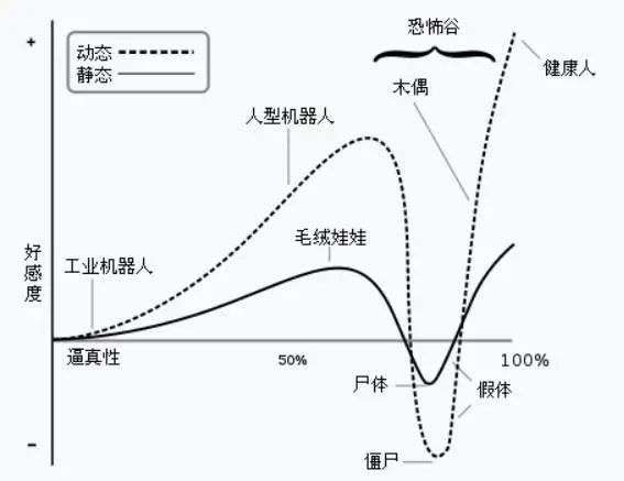 由于机器人与人类在外表、动作上相似,所以人类会对机器人产生正面情感;到达特定程度时,机器人与人类间的细微差别会显得非常刺眼恐怖,人类的反应突然变得极为负面;当相似度继续上升,人类的情感反应再度回到正面,产生人类与人类之间的移情作用。