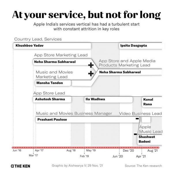 除了Sabharwal,前述所有人员均已退出原有角色。在某些情况下,替补的高管也跳槽了。苹果也在很长一段时间内一直空缺着关键职位。例如,印度服务团队在将近一年的时间里一直没有国家经理,直到2020年6月Ipsita Dasgupta(之前在Disney+Hotstar)加入团队。