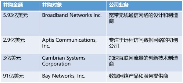 其中,最重要的一次并购,就是以91亿美元的价格,买下了数据网络公司Bay Networks(海湾网络)。