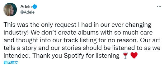 11月21日,Adele发布推文,称“在不断变化的行业中这是我的唯一要求。我们并不会为如此精心制作的专辑无缘无故地设置曲目列表。我的作品在讲述故事,这故事也应当按照我的意图被倾听。感谢Spotify的倾听”。