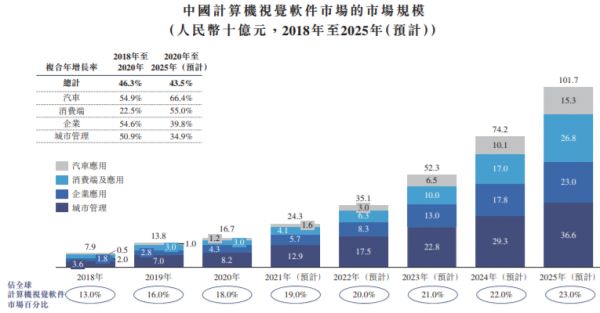 另据弗若斯特沙利文公司报告,按2020 年收入计算,商汤科技已是亚洲收入排名最高的 AI公司,同时也是中国最大的计算机视觉软件提供商,占据国内计算机视觉市场11%的份额。报告同时指出,中国计算机视觉市场预计于2025年达到1017亿元,所占全球整体市场份额也将提升至23%。由此可见,商汤科技的增长潜力空间依然广阔。