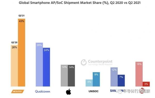 对于当前手机芯片市场的竞争格局,调研机构Counterpoint Research报告显示,联发科以43%的市场份额位居第一,高通以24%的份额位列第二,苹果则稳定在14%。自2020下半年以来,联发科已经连续四季度登顶全球手机芯片市场份额第一。