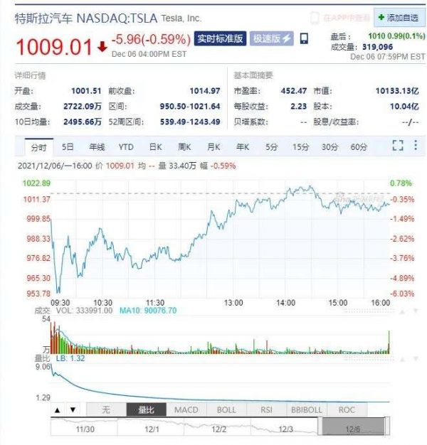 受上述消息影响,特斯拉(TSLA)本周一股价一度大跌约6%,股价最低触及950.5美元,较11月4日创下的1229.91美元的纪录收盘高点下跌约23%;截至美东时间12月6日收盘,特斯拉股价跌0.59%,报1009.01美元,公司市值10133.13亿美元,时隔一个月“蒸发”超2000亿美元。