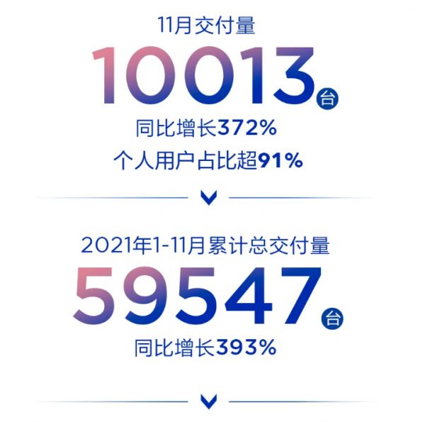 11月份,哪吒汽车交付量为10013辆,同比增长372%,增速为新势力销量前六名中最高。今年1-11月,其累计交付近6万辆,同比增长393%,距离其6.5万辆的年度目标已经近在咫尺。