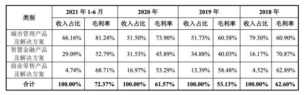 从2018年至2020年和2021年上半年,公司的主营业务毛利率分别为62.60%、53.13%、61.57%和72.37%。由于业务场景的复杂性,客户需求的多样性等原因,AI解决方案产品的毛利率低于易标化的软件产品。