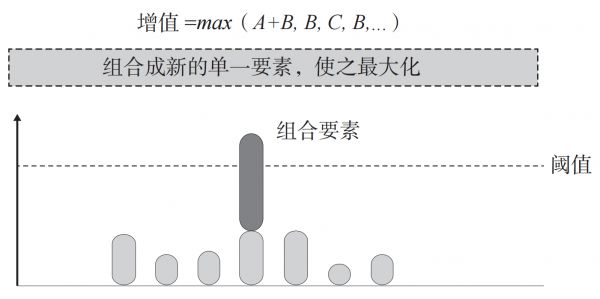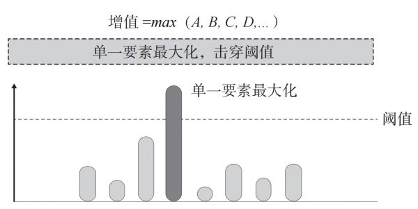 从数学上看,组合思维其实就是最大数思想,一种方式是找到最大、最能够击穿阈值(突破问题)的单一要素,然后把资源都投入这个单一要素,力出一孔,迅速地击穿阈值,如上图。