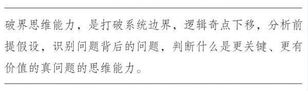 问题比答案更加重要,发问的能力比解决问题的能力更重要。破界思维能力,就是洞察本质的能力,其作用是揭开问题表象,抓住问题本质,打破原有系统的思维局限,开展更大边界更有价值的创新,而阻碍组织或个人破界或转型的难点就在于“既有心智”。