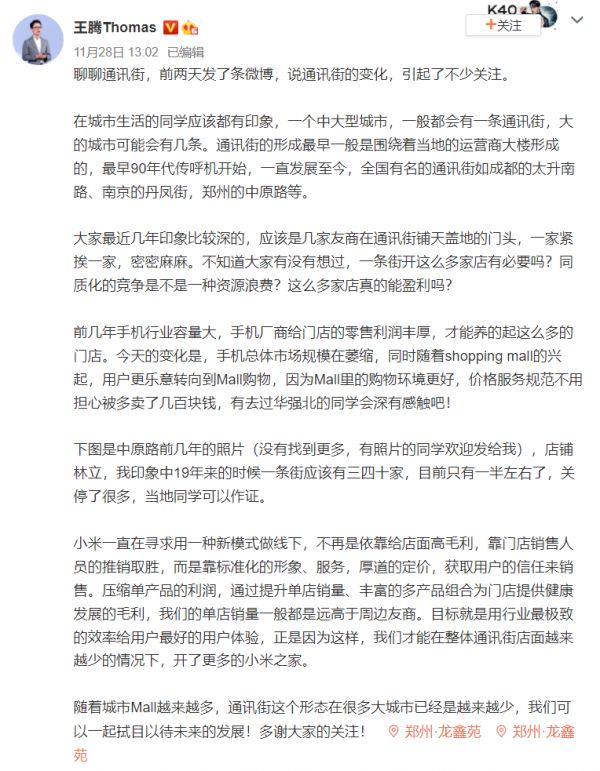 小米河南省分公司总经理王腾此前在微博就曾表示,手机用户正在转向商场,而友商的传统线下渠道正在“萎缩”。
