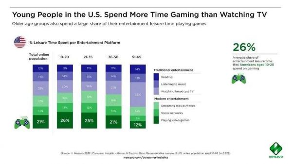 根据Newzoo的问卷调查结果,美国人平均将21%的娱乐时间用于玩游戏,这项比例仅略低于观看电视。如果针对不同年龄段的人群进行分析,Newzoo发现对美国年轻人来说(10~20岁和21~35岁),玩游戏是他们最喜欢的娱乐活动,占娱乐时间的比例超过了逛社交媒体、看电视和电影。