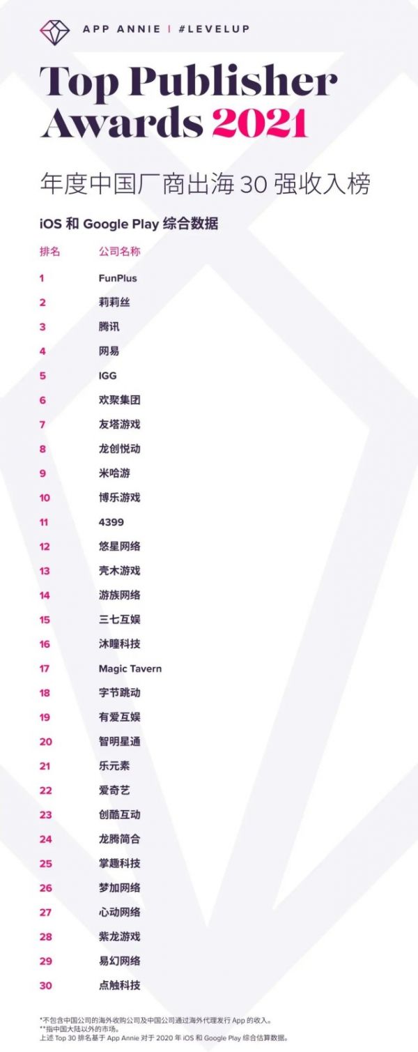 另一方面,爱奇艺游戏业务的出海是有一番作为的。2021年5月14日在上海召开的爱奇艺世界大会游戏高峰论坛上,爱奇艺还向外界披露了过去一年中在“游戏出海”方面取得的成绩:App Annie全球发行商第29名,年度中国厂商收入榜第22名。App Annie全球发行商第29名,年度中国厂商收入榜第22名。