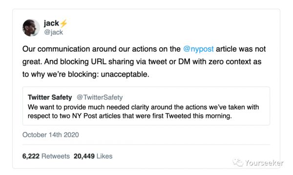 “我们此次沟通得并不好。我们在没给出上下文的情况下阻止了该文通过推文或 DM 分享,为什么阻止?因为不可接受(虚假信息)。”