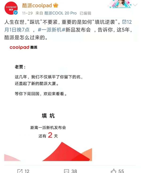 这条微博并没有引起太大的关注,毕竟酷派被乐视拖累的快要被消费者遗忘了,喊话更多是为自己鼓气,让自己有勇气正视失去的5年时光。