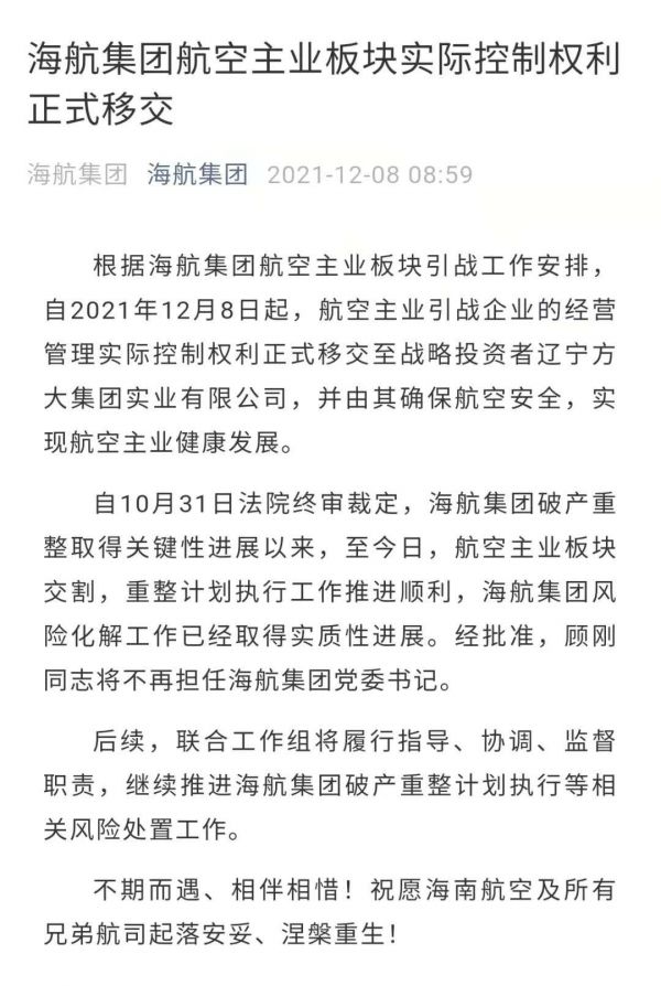 12月8日,海航官方宣布,航空主业板块的经营管理实际控制权正式移交至辽宁方大,临危受命的顾刚也不再担任海航集团党委书记。海航自此翻开新的一页。